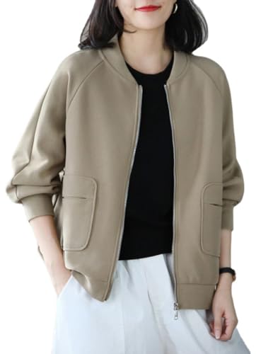 [TRVELBETT] ジャケット レディース カーディガン アウター ブルゾン MA-1 トップス スタジャン ジャンパー ノーカラー 羽織り 春 秋 カーディガン ミリタリージャケット リブ ゆったり カジュアル 軽量 通勤 普段着 (カーキ,L)