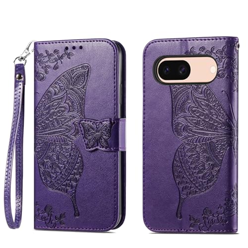 Googleピクセル8A 用携帯カバー カード収納ス 蝶の図案をカバーするクリップ付き財布型【ZIHEWJLAI 】Google Pixel 8A ケース 手帳型 内蔵マグネット ピクセル8a 手帳型 カバー ケース 耐衝撃 全面保護 pixel8a スマホケース 手帳 カードポケット付き スタンド機能 手綱 紫