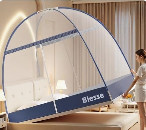 蚊帳 テント ワンタッチ 【2025改良型・折りたたみ・底生地付き】 かや モスキートネット ベッドテント 虫よけ 蚊よけ ムカデ対策 組み立て簡単 収納便利 通気性 高密度 夏用 (ネービーブルー, 180*200*152cm)