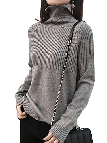 [Waiehu] タートルネック リブ編み セーター ハイネック サイドスリット シンプル 柔らかい 着痩せ レディース 無地 ゆるニット カジュアル 長袖 トップス ケーブルニット プルオーバー ポケット ゆったり ストレッチ クルーネック 暖かい 秋冬 かわいい おしゃれ 灰色 ライトグレー S