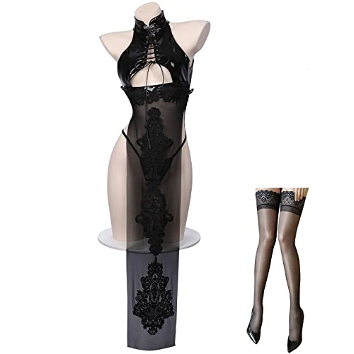 [SENMHS] コスプレ セクシー チャイナ チャイナドレス チャイナ服 ランジェリー スカート レザー風 PU ベビードール チャイナドレス風 シースルー ボンデージ ボディコン エナメル PVC 女王様 可愛い スリップ ブラック ワンサイズ M