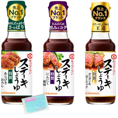 すべて見る- キッコーマン ステーキしょうゆ 3種アソートセット【(1)特製 オニオン&ガーリック (2)にんにく風味 (3)あらびきおろし 】 各種1本ずつ 合計3本セット1,880円