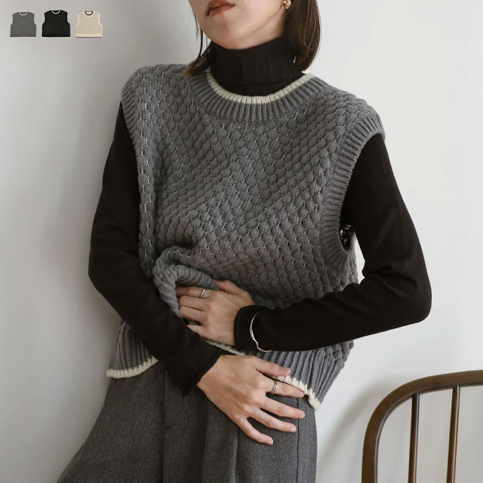 【クーポン利用で30%OFF】ポコポコバックスリットベスト / レディース 秋冬 ベスト ニットベスト ベスト レイヤード シンプル カジュアル 重ね着 バイカラー クルーネック レイヤード バックスリット バイカラー セレクトモカ selectmoca select moca