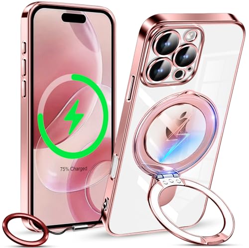 iPhone 16 Pro 用 ケース クリア MagSafe対応 隠し スタンドケース 縦横両対応 角度調整 アイフォン16 Pro 用 スマホケース 耐衝撃性 リングマグネット搭 携帯カバー ワイヤレス充電対応 透明 ストラップホール付き リングストラップ1枚付き (ローズピンク)