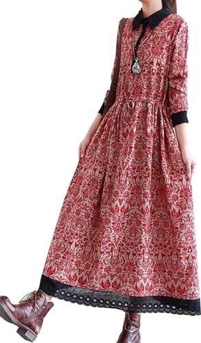 - ロングワンピース 長袖 レディース きれいめ 綿麻 花柄 総柄 ロング ロングワンピ エスニック リゾートワンピース クルーネック フレアワンピース ゆったり 体型カバー 大きいサイズ 森ガール レトロ カジュアル 送料無料3,280円