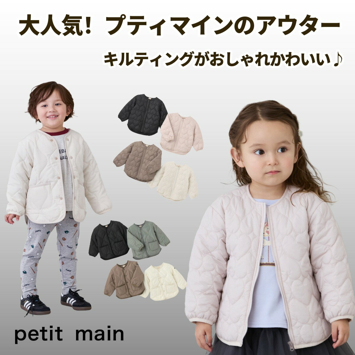 【送料無料】【petit main キルティングジャケット】プティマイン キルティング アウター フードなし ジャケットノーカラー クルーネック パイピング 男の子 女の子 子供服 キッズ ハート おしゃれ かわいい