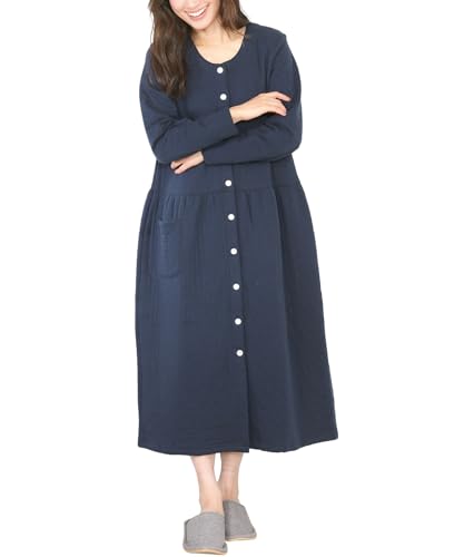 [ON NISHIKI] ネグリジェ パジャマ レディース 秋 冬 長袖 綿100% ワンピース 前開き 暖かい 肌に優しい ニットキルト ロング丈 ルームウェア 部屋着 (ネイビー:1/LL/72614)