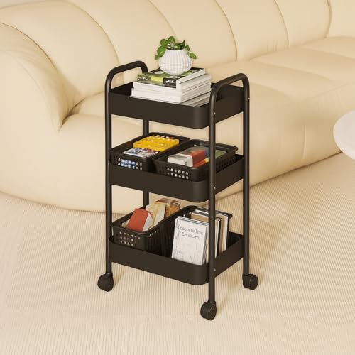 - キッチンワゴン キャスター付き棚 3段 収納ワゴン 天板付き 防錆スチールワゴン メタルラック 炊飯器 棚 ペットボトル 調味料ラック プレート 野菜 衣類収納 取り外し可能なバスケット キッチンワゴン(ブラック, 3段)4,799円