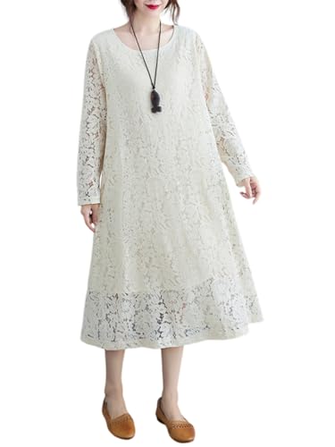 [Hanmall] レース ワンピース 7色 長袖 レディース 大きいサイズ 体型カバー カジュアル ゆったり 春夏秋 パーティー ラウンドネック レース ロング フレアワンピース 女性用ファッション