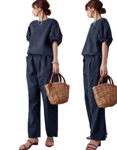 [DYIOPMFGZ] ブラウス tシャツ ワイドパンツ レディース セットアップ パンツスーツ 半袖トップス 2点セット 上下セット ガウチョパンツ きれいめ 無地 シンプル 部屋着 ゆったり 夏 (ネイビー,S)