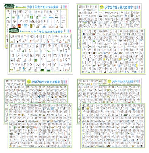 【完全防水】 小学一年生、小学ニ年生、小学三年生、小学四年生で習う漢字表 お風呂ポスター 1年生、2年生、3年生 4年生A3ユポ紙(2つ折りのA4梱包) 2枚の計8枚セット 書き順・使用例・イラスト付き 防水