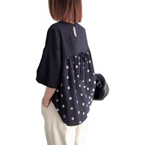 [Chiengmat] ドットトップス tシャツ レディース シャツ ブラウス 半袖トップス シフォン カットソー チュニック とろみ フレア カジュアル シースルー パフスリーブ 七分袖 涼しい 春 夏 秋 (JP, アルファベット, XL, ブラック)