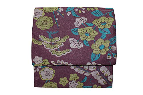 - 京袋帯 絹 お仕立て上がり 青緑 アイボリー 猫 椿 全通柄 日本製 新品47,300円