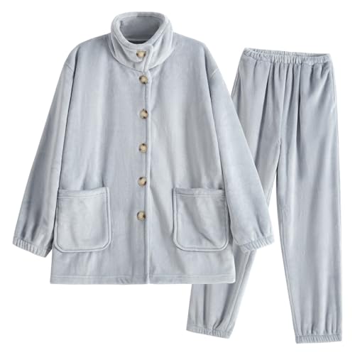 [クモリ] 冬 着る毛布 上下セット M ユニセックス 暖かい 男女兼用 フランネル ふわふわ 前開き ポケット付き ボタン付き ハイネック リブ袖 吸湿発熱 静電気対策 丸洗える ルームウェア 部屋着 あったか レディース メンズ 軽量 防寒 保温 パジャマ M グレー