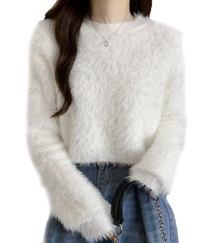 [miniministore] ショート丈 シャギーニットトップス韓国風 ニットセーター レディース カラーリッチシャギーニット もこもこボリューム感 モヘアトップス フェザーヤーンニット 秋冬(ホワイト,ワンサイズ)