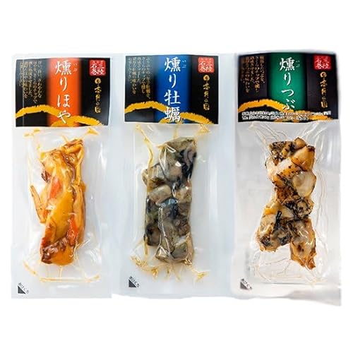 - おつまみ 日高見の国 燻り4種おつまみセット(牡蠣30g・帆立2粒・ほや30g・つぶ30g) 珍味 酒の肴 カキ ホタテ ホヤ ツブ 魚介類 海鮮 加工品 ポイント消化 高級珍味2,200円
