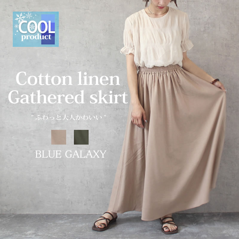 【クーポンで半額●6/16(金)20:00〜23:59】コットンリネン ギャザースカート ボトムス スカート Aライン 麻 綿 綿麻 春夏 2023春夏新作 コットン プルオン ウエストゴム 軽い ゆったり リラックス 体型カバー iボトムス 春夏 レディース