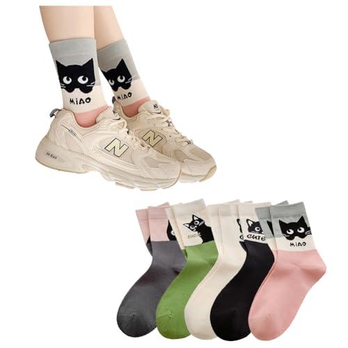 [FASELE] 靴下 レディース おしゃれ ソックス 女子用 婦人用ソックス クルーソックス 可愛い 猫 動物 花柄 コットン 綿 通気性 柔らかい 春夏 秋冬 オールシーズン ミッドチューブソックス ギフト 贈り物 プレゼント 5足セット