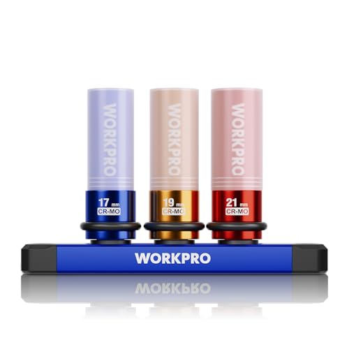 WORKPRO インパクトレンチ ソケット 3本組 インパクト用ホイルナットソケット ホイール用ソケットセット キズ防止プロテクター付き ホルダー付き 差込角12.7mm 【サイズ17mm 19mm 21mm】 全長86mm CR-MO材質 自動車専用ホイールナットの締付け・緩め作業 3点セット