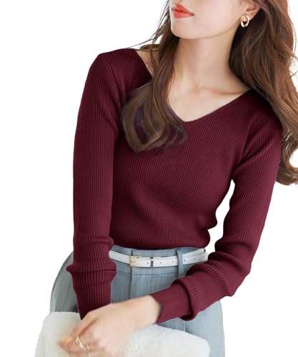 - リブニット レディース タイト トップス Vネック 長袖 薄手ニット コットン リブニット レディース タイト トップス Vネック 長袖 ワイン リブニット タイトニット トップス 韓国ファッション2,800円