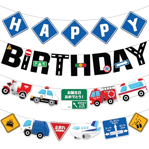 HaHaHa!【日本限定!】 乗り物 はたらく車 パトカー 消防車 救急車 ゴミ収集車 郵便バイク 飛行機 誕生日 レターバナー 飾り ガーランド デコレーション HAPPY BIRTHDAY バースデー パーティー装飾 男の子 お祝い 記念日 (乗り物)