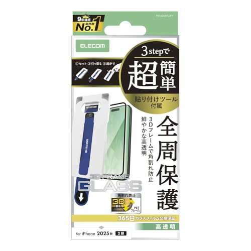エレコム iPhone 17 ガラスフィルム ガラスフィルム 光沢 強化ガラス 硬度10H フレーム付き 角割れしない 3Dフレーム 衝撃吸収 指紋がつかない 気泡が入らない 【簡単貼り付けツール付き】 [365日交換保証付き] PM-A25AFLGFT