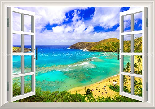 絵画風 壁紙ポスター (はがせるシール式) -窓の景色- エメラルドのハナウマ・ベイと常夏の雲 ハワイ オアフ島 ビーチ リゾート 海 【窓仕様/トリックアート】 キャラクロ HWI-040MA1 (A1版 830mm×585mm) 建築用壁紙+耐候性塗料 <日本製> ウォールステッカー お風呂ポスター