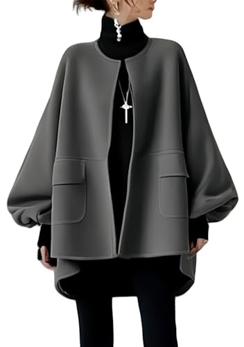 [YUANYUAN] ショットジャケット レディース アウター ウールコート 長袖 ランタンスリーブ ラウンドネック ポケット付き おしゃれ 体型カバー ゆったり 着痩せ 可愛い カジュアル 大きいサイズ 通学通勤 普段着 秋冬 (写真色,L)