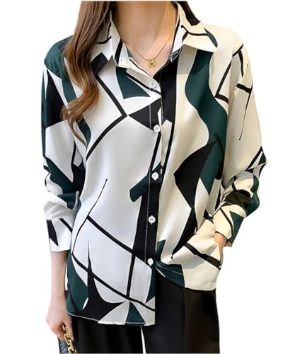 [Four leaf] 【サラッと心地よい肌触り】 ブラウス シャツ レディース 襟付き 長袖 トップス 幾何学模様 春 夏 秋 柄付き カジュアル レトロ柄 柄シャツ カットソー きれいめ 【大人な女性】 (M, 緑)