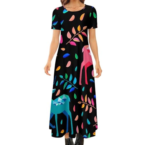 ワンピース 鹿 葉 レディース 半袖 ロングワンピース サマードレス 夏 マキシ丈 体型カバー Aライン クルーネック リゾートワンピース ロングドレス パーティードレス スリム 着痩せ エレガント お洒落 M