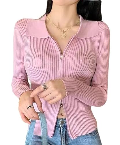 [Four leaf] おしゃれ ニット トップス カーディガン セーター カットソー レディース ジップアップ 長袖 襟付き セクシー 無地 服 リブニット リブ編み ジップカーディガン ニットカーディガン (ピンク)