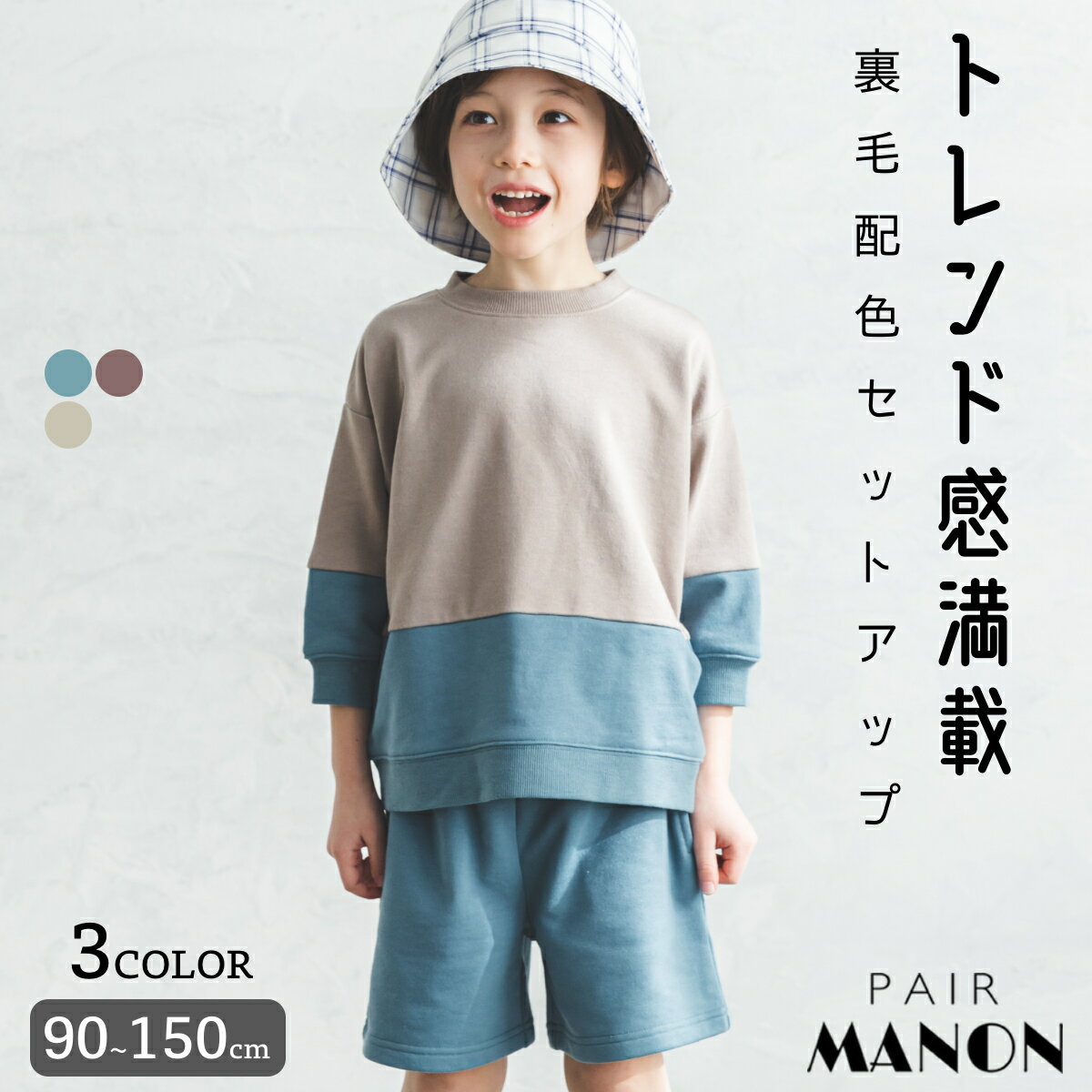 【SALE】 【サラッとスウェット】ユニセックス 無地 配色 7分袖 裏毛 ハーフパンツ セットアップ リラックス ワンマイル ルームウェア ポケット ウエストゴム 90cm 100cm 110cm 120cm 130cm 140cm 150cm pairmanon ペアマノン 子供服 キッズ プチプラ おしゃれ トレンド 春