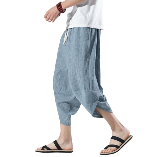 [Fasshonrida] サルエルパンツ メンズ アラジンパンツ 夏用 ズボン 7分丈 ワイドパンツ 大きいサイズ ゆったり ボトムス イージー ぱんつ 涼しい リネン クロップド エスニック 袴 カジュアル 春 夏 blue XL