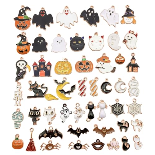 [Kingsiely] チャーム パーツ ハロウィン 50個セット コウモリ おばけ カボチャ 蜘蛛 蜘蛛の巣 猫 チャーム アクセサリーパーツ ハロウィン デコパーツ 3D 立体 合金 オーナメント ネックレス イヤリング ペンダント ジュエリー DIY ハンドメイド デコパーツ 手芸材料 工芸品 (A 50個)