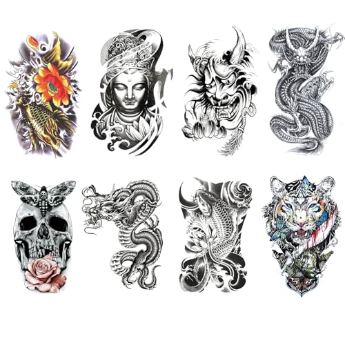 HONJALOタトゥーシール 大判 和彫り 長持ち 防水 入れ墨シール おしゃれ かっこいい 刺青シール 和柄メンズ レディース腕、肩、足に適しています 15x21CM (ハイブリッドシリーズ(8枚))