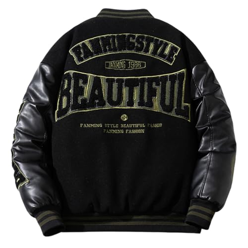 [D.IIZOO] 冬服 フライトジャケット 刺繍 中綿 スタジャン メンズ アワードジャケット スタジアムジャンパー ゆったり PU革袖 ルーズブルゾン カジュアル おしゃれ 大きいサイズ 男女兼用 E1114B (JP, アルファベット, XL, ブラックグリーン)