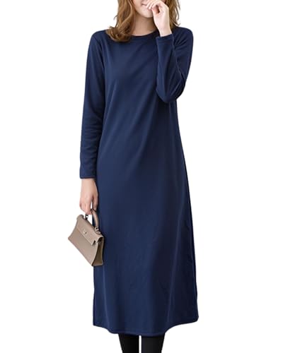 [Four leaf] 【おしゃれ×リラックス】 ワンピース レディース 春 秋 長袖 シャツワンピース tシャツワンピース 膝丈 ミモレ丈ワンピース 膝下丈 ミモレ丈 ロング ロング丈 無地 秋冬 (M, ネイビー)