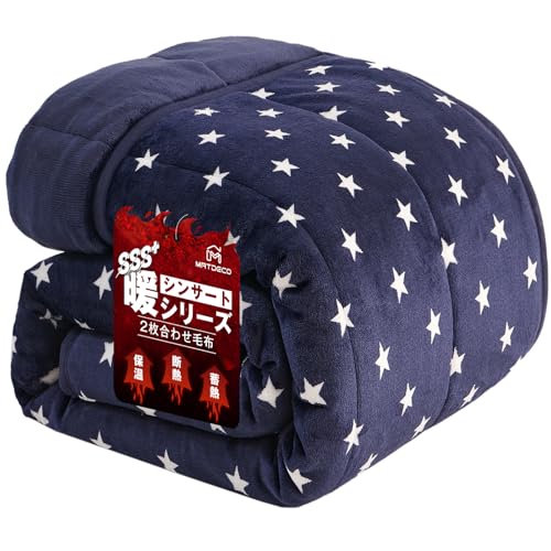 Matdeco 毛布 シングル 冬 厚手 ブランケット 冬用 掛け毛布 毛布布団 2枚合わせ 高機能中綿素材シンサート使用 四層構造 襟付き洗える フランネル毛布 合わせ毛布 オールシーズン適用 断熱素材 超極細繊維 モフモフ 保温軽量 毛抜けない 静電気防止 丸洗いOK 140×200cm スター柄ネービー
