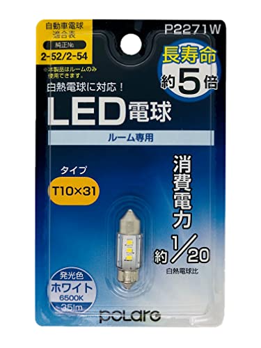 すべて見る- 日星工業 POLARG(ポラーグ) ルームランプ用 LED電球 12V T10x31 電球色 3000K 35lm 1個入 白熱電球同等サイズ ECE規則 JIS規格 P2271C 車検対応 信頼の純正バルブメーカー528円〜
