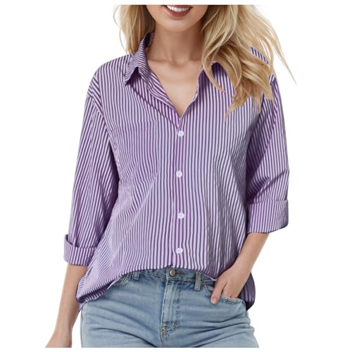 [Foreted] ストライプシャツ レディース 長袖 ブラウス シャツ トップス 春服 カジュアル 無地 シンプル ゆったり おしゃれ ワイシャツ 襟付き ストライプ チュニック 大きいサイズ オフィス 就活 春 夏 可愛い 通勤 OL 着痩せ 秋(パープル,L)