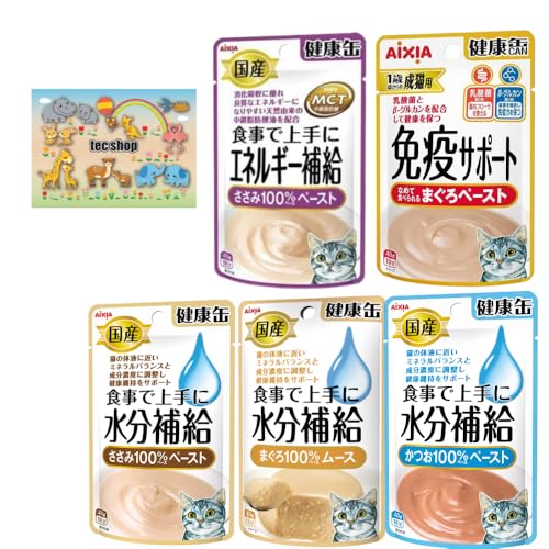 【5種アソート】[アイシア]国産 健康缶パウチ 水分補給かつお・まぐろムース・エネルギー補給ささみ・水分補給ささみペースト・免疫サポートまぐろペースト 各40g 猫用ウェっとフード tec shopオリジナルポケットティッシュ付き