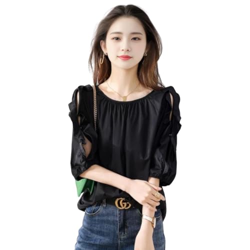 - 【在庫限り】[ジェイスコット] 肩スリットブラウス オープンショルダー 袖フリル オシャレトップス 肌見え 5部袖 丸首 肩出し きちんと感 肩見せ スタイリッシュ 女性 シック エレガント デザイン袖 軽い 華奢見え 透けにくい レギュラー きちんと見え 体型カバー リッチ トップス 洗濯 フリル 大人女子 袖コンシャス フェミニン パフスリーブブラウス 裏地無し ブラック JS95-BK-M4,580円
